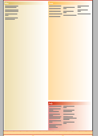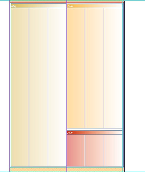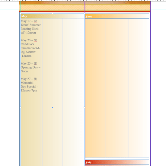 So the basic design of the ad is starting to take shape. I’ve set up the space for the client’s message and ad at the top, the event locations at the bottom, and the space for the calendar text in the middle. Now to setting up the style sheets for the calendar text. This will make it easier to color match the calendar text to the locations.
