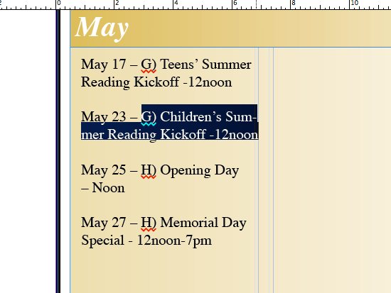 First, I enter some of the sample text of local events provided by the ad rep. Each entry has the day, a letter that coordinated to the location guide at the bottom, and a description of the event and the time.