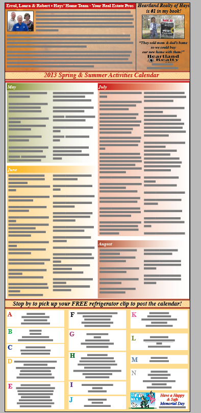 Here’s a closer look at the top section. The client also has refrigerator magnet clips to give away, and invites readers to come in and pick one up to keep the calendar handy. Nice marketing idea.